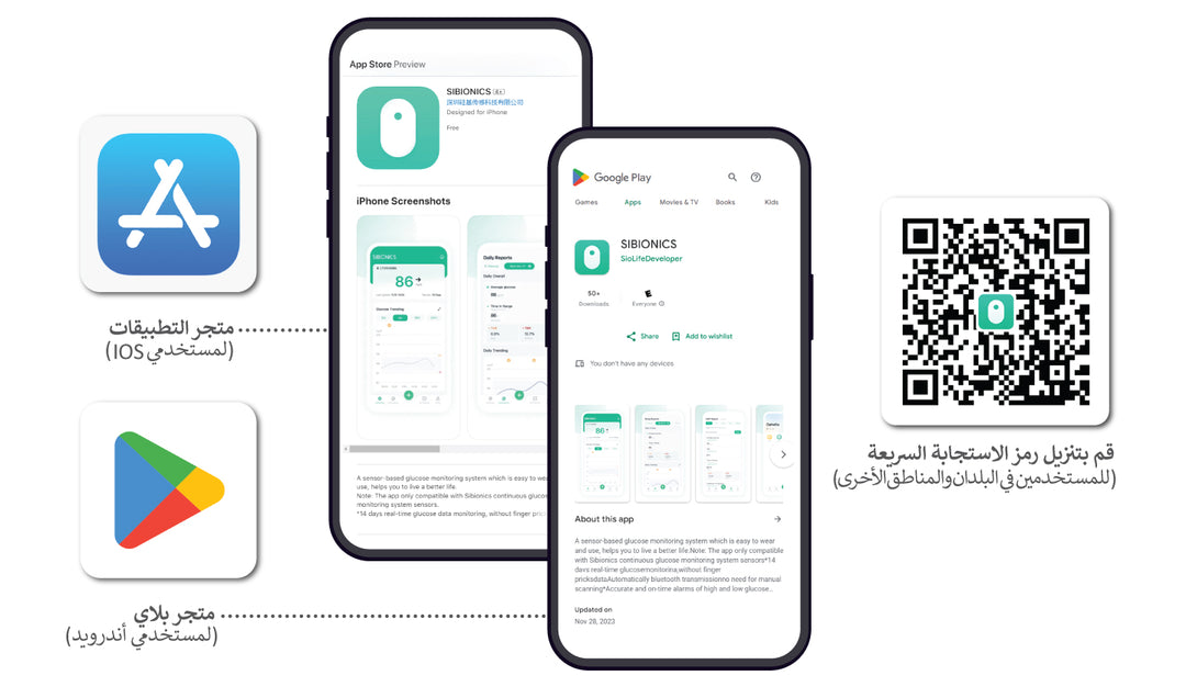 - بالنسبة للمستخدمين في دول الاتحاد الأوروبي أو المملكة المتحدة، يرجى تنزيل تطبيق SIBIONICS على هاتفك الذكي من Apple App Store أو Google Play Store.